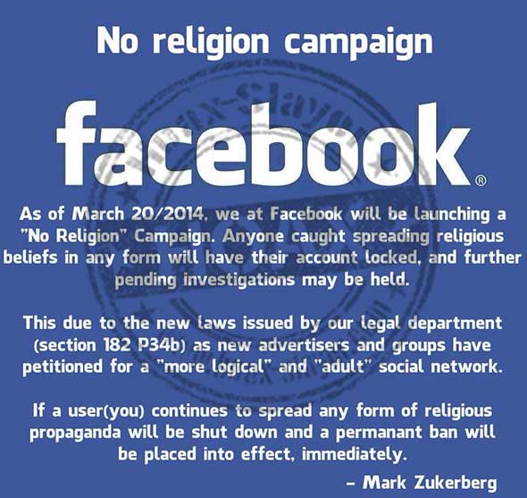 This message, which is currently circulating rapidly via social media websites, causing outrage and indignation as it travels, claims that Facebook is about to launch a 'No Religion' campaign. According to the message, come 20th March 2014, Facebook will be implementing a campaign designed to stop people from spreading their religious beliefs on the network.
